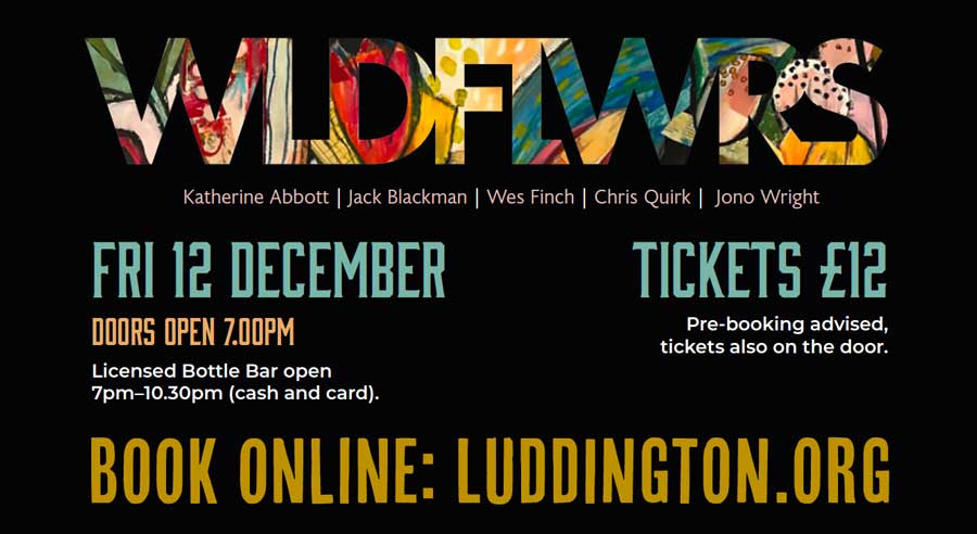We are so pleased to welcome back WLDFLWRS to Luddington. Featuring local musicians Katherine Abbott, Jack Blackman, Wes Finch, Chris Quirk and Jono Wright – a collective of songwriting friends with a love of West Coast Americana music, expect strong melodies, vocal harmonies, along with choice covers and some collaboratively crafted original songs.